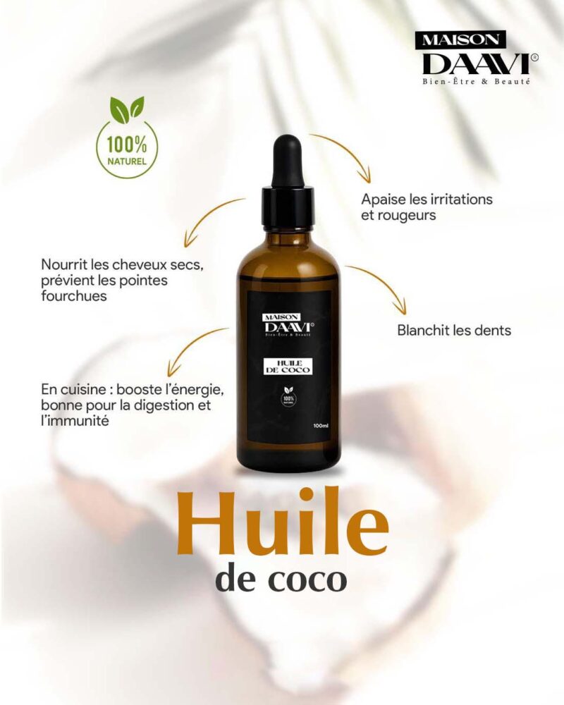 L’huile de coco, pure et naturelle, est un soin indispensable pour une peau et des cheveux resplendissants. Enrichie en propriétés protectrices et hydratantes, elle nourrit et adoucit la peau tout en renforçant les cheveux en profondeur, leur redonnant brillance et souplesse.